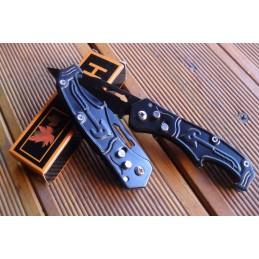 Couteau au design agressif Pliant de Poche avec Sa lame en acier inoxydable tant aux lignes tendues est à ouverture facile mesure 8,5 cm et possède une sécurité, manche de 12 cm en acier/bois gravé, et poids 160 g.