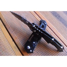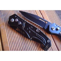 Couteau automatique à pression, design agressif Pliant de Poche avec Sa lame en acier inoxydable tant aux lignes tendues est à ouverture facile mesure 7 cm elle est en acier inoxydable et possède une sécurité, manche ergonomique de 9 cm en acier noir gravé, et poids 65 g.
