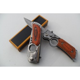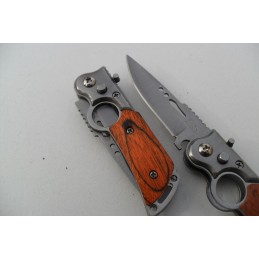 Couteau automatique à pression, design agressif Pliant de Poche avec Sa lame en acier inoxydable tant aux lignes tendues est à ouverture facile mesure 6,5 cm elle est en acier inoxydable et possède une sécurité, manche ergonomique de 8,5 cm en bois avec anneau, et poids 60 g.