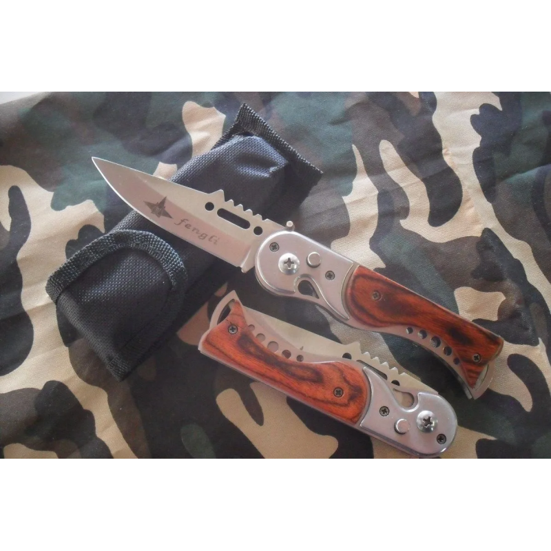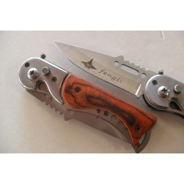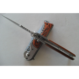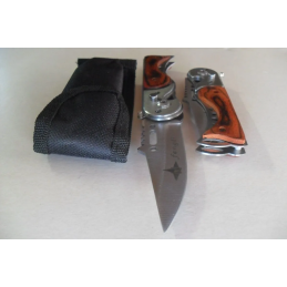 Couteau automatique a pression, design agressif Pliant de Poche avec Sa lame en acier inoxydable dentée sur le dessus tant aux lignes tendues est à ouverture facile mesure 8,5 cm elle est en acier inoxydable et possède une sécurité, manche bois de 11,5 cm, et poids 115 g. Sécurité anti-ouverture & anti fermeture. Ouverture très rapide à l'aide d'un bouton poussoir.